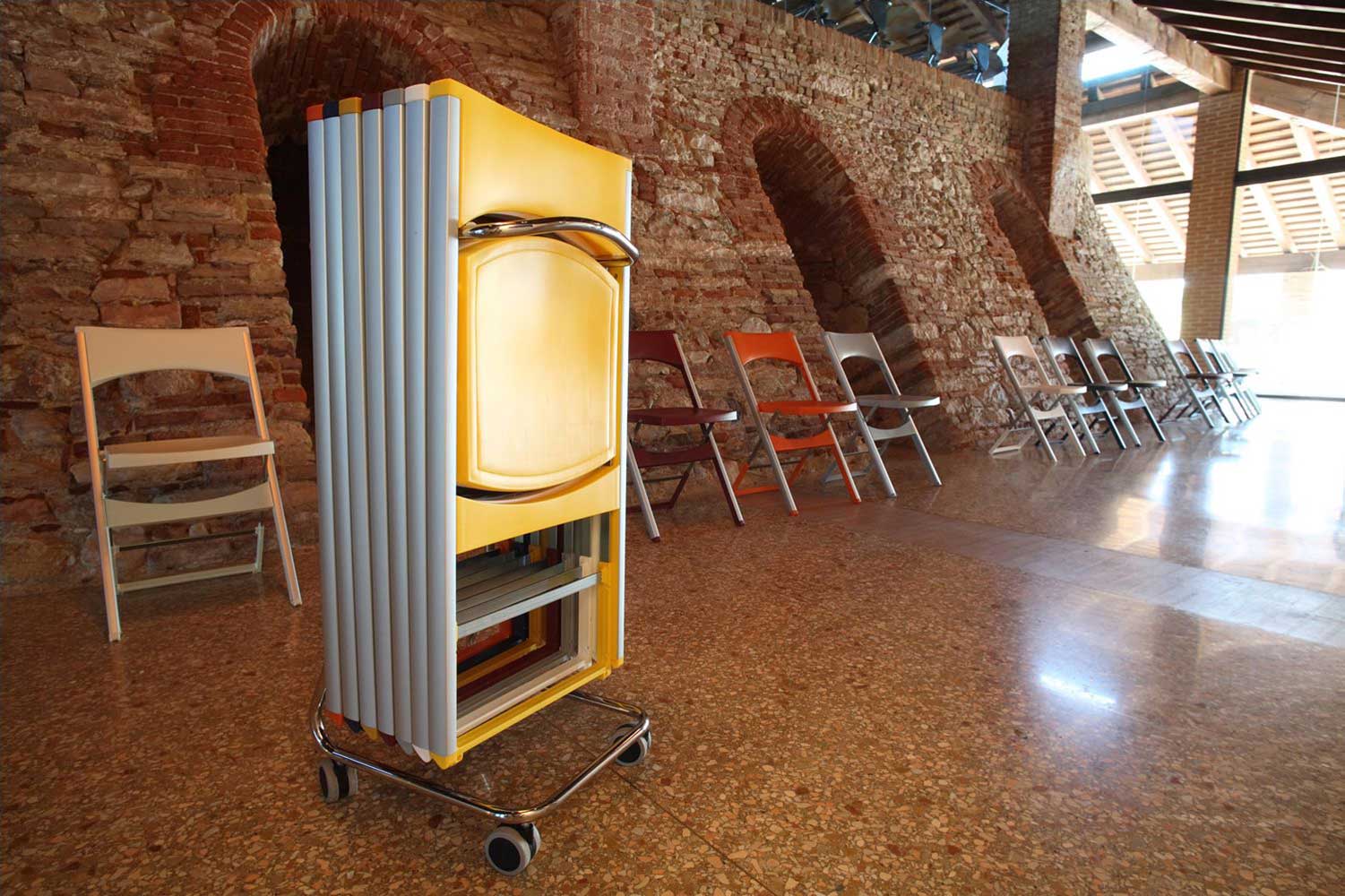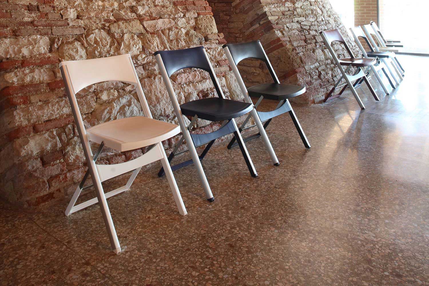 Satz von sechs Klappstühlen, die auf einem Rack gelagert werden. Mehrere Farben erhältlich.