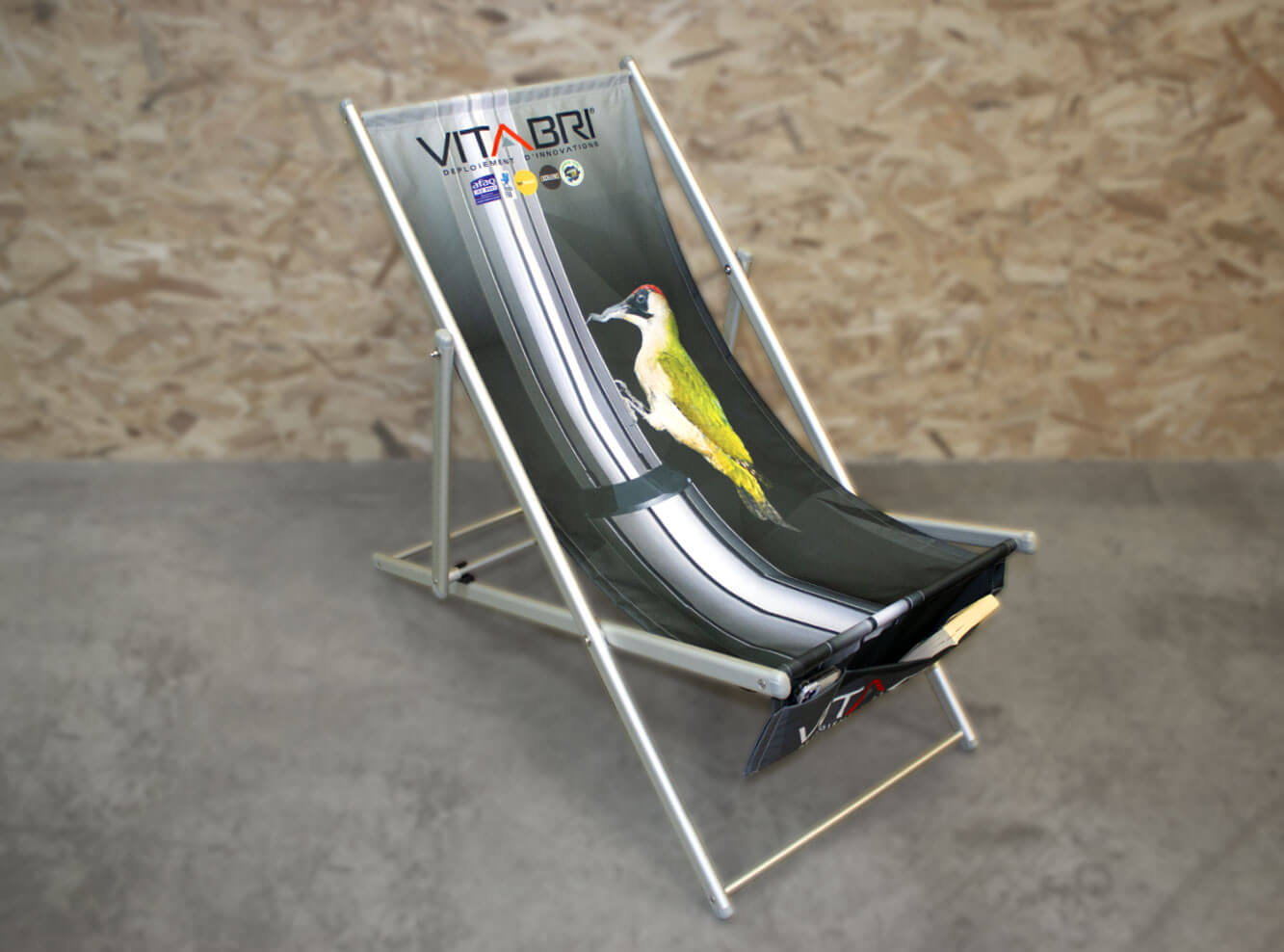 Unser Liegestuhl ist dank seiner Aluminiumrahmenstruktur leicht und widerstandsfähig. Der persönlich gestaltbare Bezug dient als Werbeträger bei Ihren Events.
